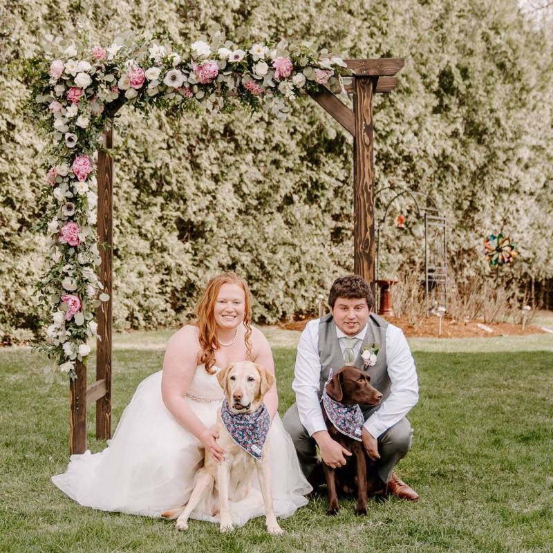This couple celebrated their intimate backyard wedding during Covid with their family, their dogs, and gorgeous pink florals.
