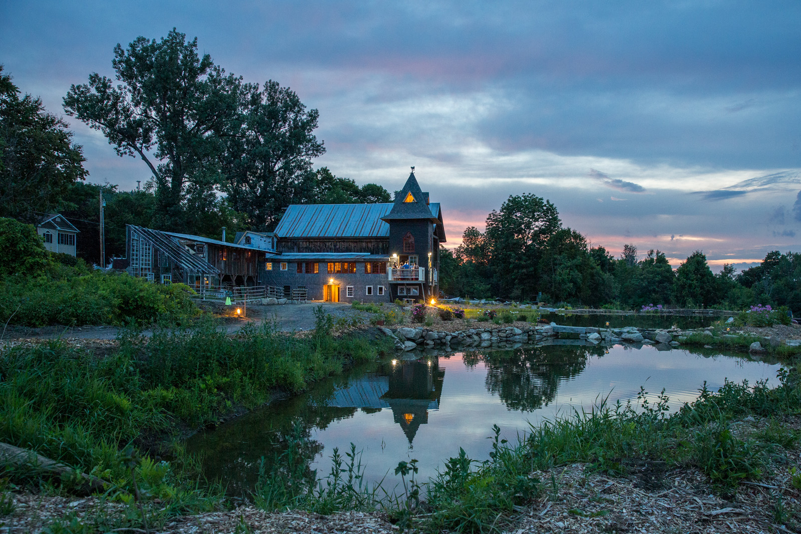 The barn and firepit at dusk at Lareau Farm Inn in Vermont